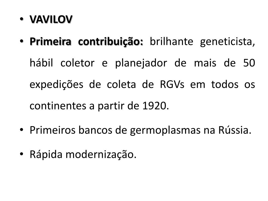 VAVILOV • Primeira contribuição: brilhante geneticista, hábil coletor e planejador de mais de 50 expedições de coleta de RGVs em todos os continentes a partir de 1920. • Primeiros bancos de germoplasmas na Rússia. • Rápida modernização.