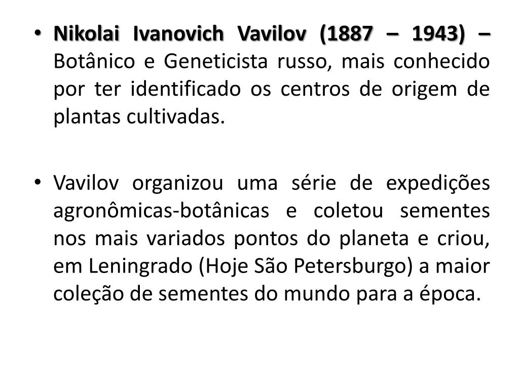 Nikolai IvanovichVavilov (1887 – 1943) – Botânico e Geneticista russo, mais conhecido por ter identificado os centros de origem de plantas cultivadas. • Vavilov organizou uma série de expedições agronômicas-botânicas e coletou sementes nos mais variados pontos do planeta e criou, em Leningrado (Hoje São Petersburgo) a maior coleção de sementes do mundo para a época.