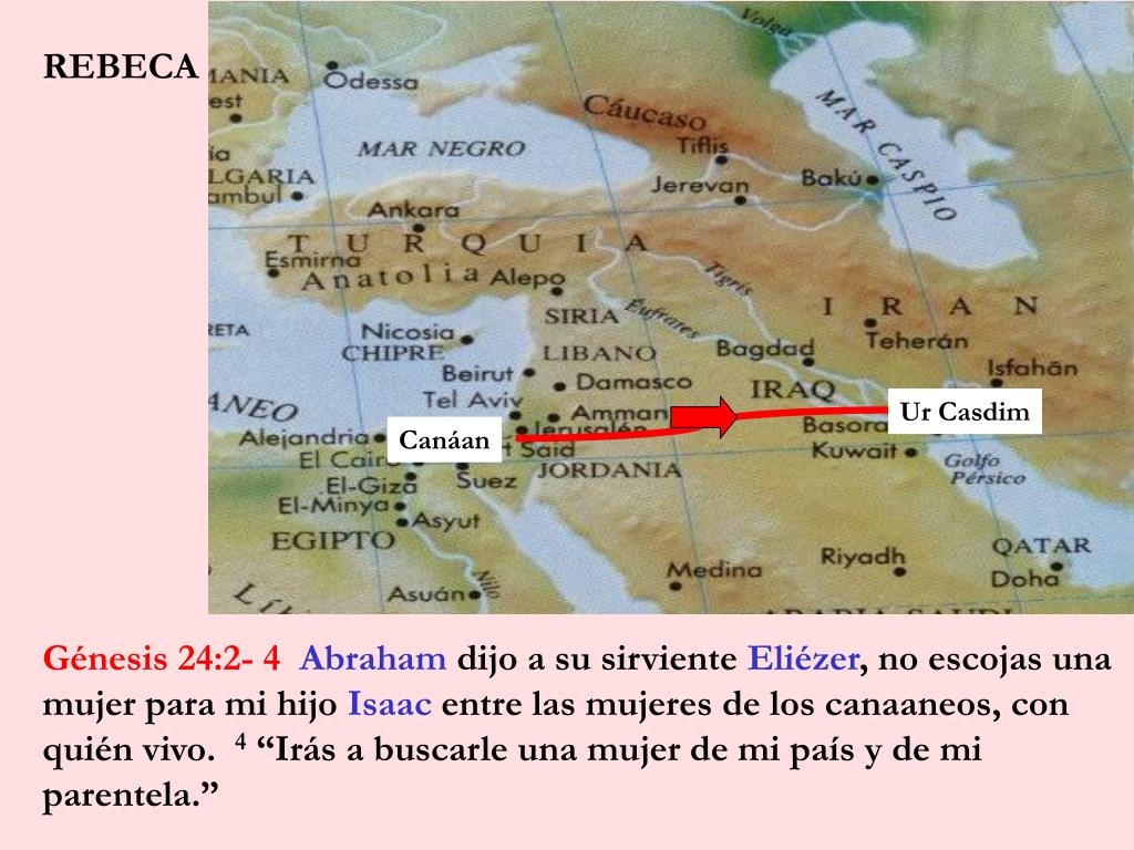 Ur Casdim Canáan REBECA Génesis 24:2- 4Abraham dijo a su sirviente Eliézer, no escojas una mujer para mi hijo Isaac entre las mujeres de los canaaneos, con quién vivo. 4 “Irás a buscarle una mujer de mi país y de mi parentela.”