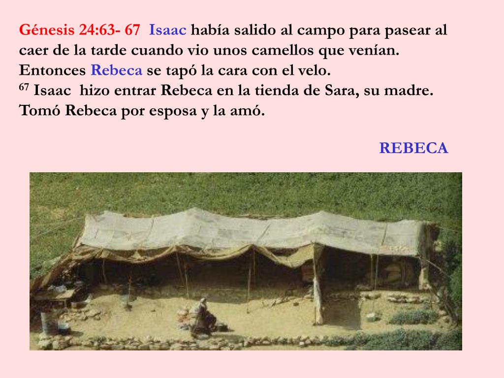 Génesis 24:63- 67Isaac había salido al campo para pasear al caer de la tarde cuando vio unos camellos que venían. Entonces Rebeca se tapó la cara con el velo. 67 Isaac hizo entrar Rebeca en la tienda de Sara, su madre. Tomó Rebeca por esposa y la amó. REBECA