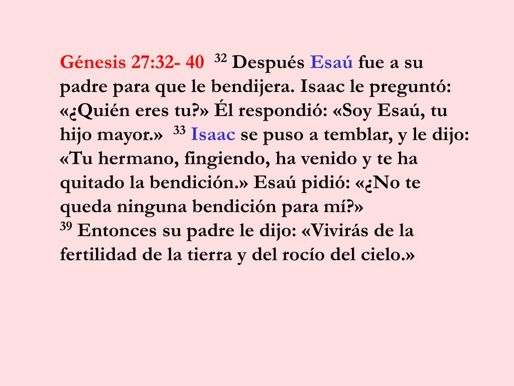 Génesis 27:32- 4032 Después Esaú fue a su padre para que le bendijera. Isaac le preguntó: «¿Quién eres tu?» Él respondió: «Soy Esaú, tu hijo mayor.» 33Isaac se puso a temblar, y le dijo: «Tu hermano, fingiendo, ha venido y te ha quitado la bendición.» Esaú pidió: «¿No te queda ninguna bendición para mí?» 39 Entonces su padre le dijo: «Vivirás de la fertilidad de la tierra y del rocío del cielo.»