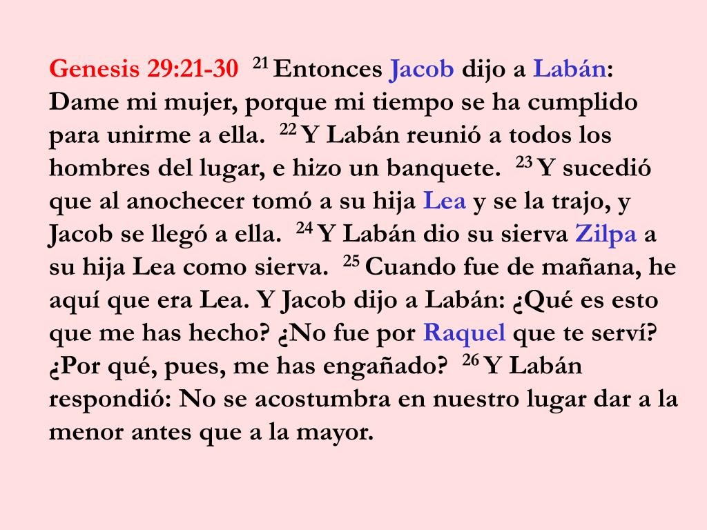 Genesis 29:21-3021 Entonces Jacob dijo a Labán: Damemi mujer, porque mi tiempo se ha cumplido para unirme a ella. 22 Y Labán reunió a todos los hombres del lugar, e hizo un banquete. 23 Y sucedió que al anochecer tomó a su hija Lea y se la trajo, y Jacobse llegó a ella. 24 Y Labán dio su sierva Zilpa a su hija Lea como sierva. 25 Cuando fue de mañana, he aquí que era Lea. Y Jacobdijo a Labán: ¿Qué es esto que me has hecho? ¿No fue por Raquel que te serví? ¿Por qué, pues, me has engañado? 26 Y Labán respondió: No se acostumbra en nuestro lugar dar a la menor antes que a la mayor.