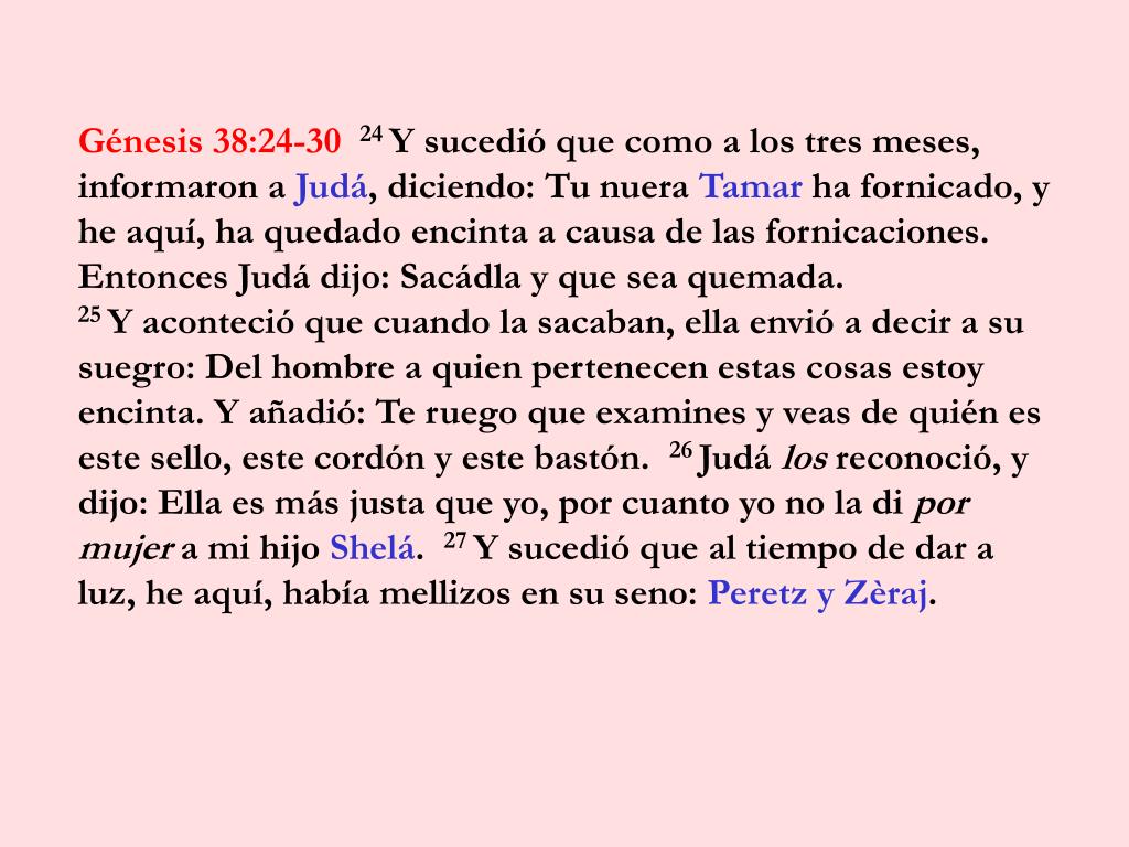Génesis 38:24-3024 Y sucedió que como a los tres meses, informaron a Judá, diciendo: Tu nuera Tamar ha fornicado, y he aquí, ha quedado encinta a causa de las fornicaciones. Entonces Judá dijo: Sacádla y que sea quemada. 25 Y aconteció que cuando la sacaban, ella envió a decir a su suegro: Del hombre a quien pertenecen estas cosas estoy encinta. Y añadió: Te ruego que examines y veas de quién es este sello, este cordón y este bastón. 26 Judá los reconoció, y dijo: Ella es más justa que yo, por cuanto yo no la di por mujer a mi hijo Shelá. 27 Y sucedió que al tiempo de dar a luz, he aquí, había mellizos en su seno: Peretz y Zèraj.