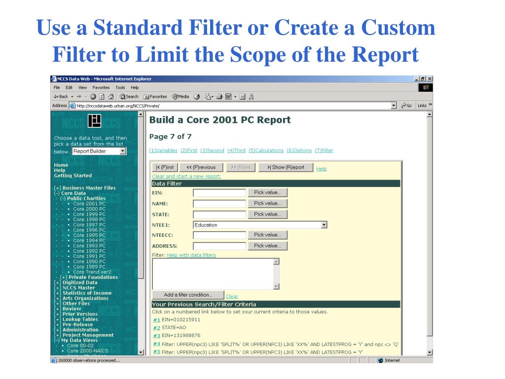 Use a Standard Filter or Create a Custom Filter to Limit the Scope of the Report