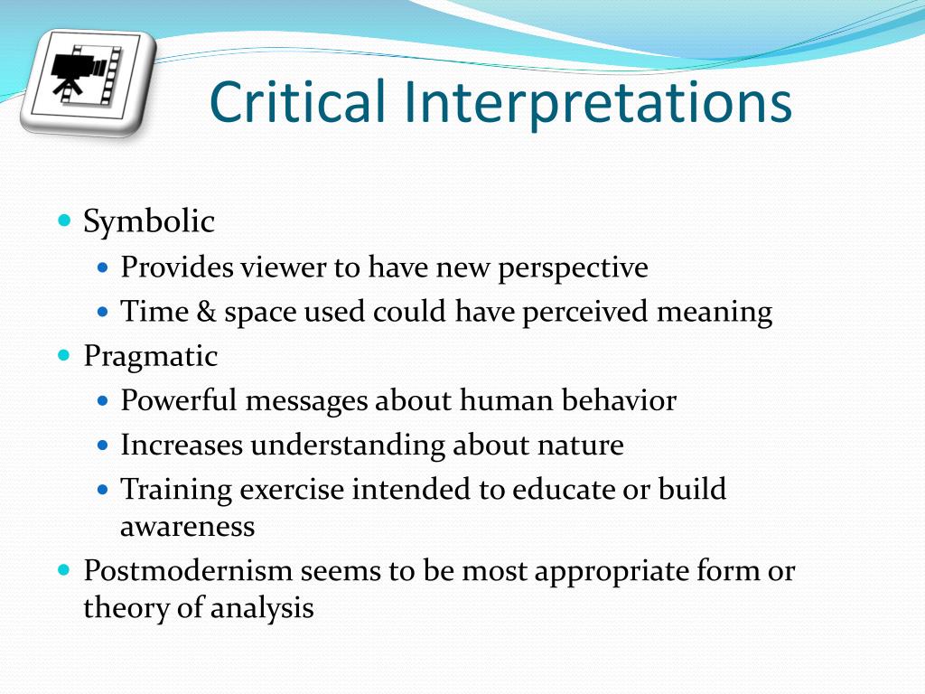 Critical Interpretations • Symbolic • Provides viewer to have new perspective • Time & space used could have perceived meaning • Pragmatic • Powerful messages about human behavior • Increases understanding about nature • Training exercise intended to educate or build awareness • Postmodernism seems to be most appropriate form or theory of analysis