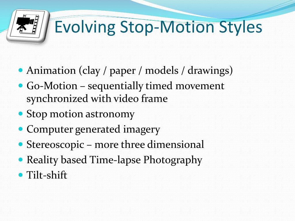 Stop Motion Film Making. A Critical Analysis of. Presented By: Michael Toner / Art 683. Evolving Stop-Motion Styles . Animation (clay / paper / models / drawings) Go-Motion – sequentially timed movement synchronized with video frame Stop motion astronomy Computer generated imagery