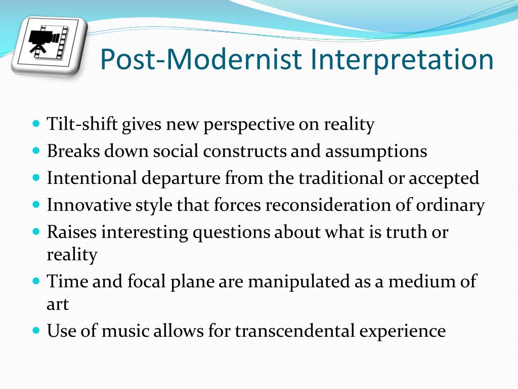 Post-Modernist Interpretation • Tilt-shift gives new perspective on reality • Breaks down social constructs and assumptions • Intentional departure from the traditional or accepted • Innovative style that forces reconsideration of ordinary • Raises interesting questions about what is truth or reality • Time and focal plane are manipulated as a medium of art • Use of music allows for transcendental experience