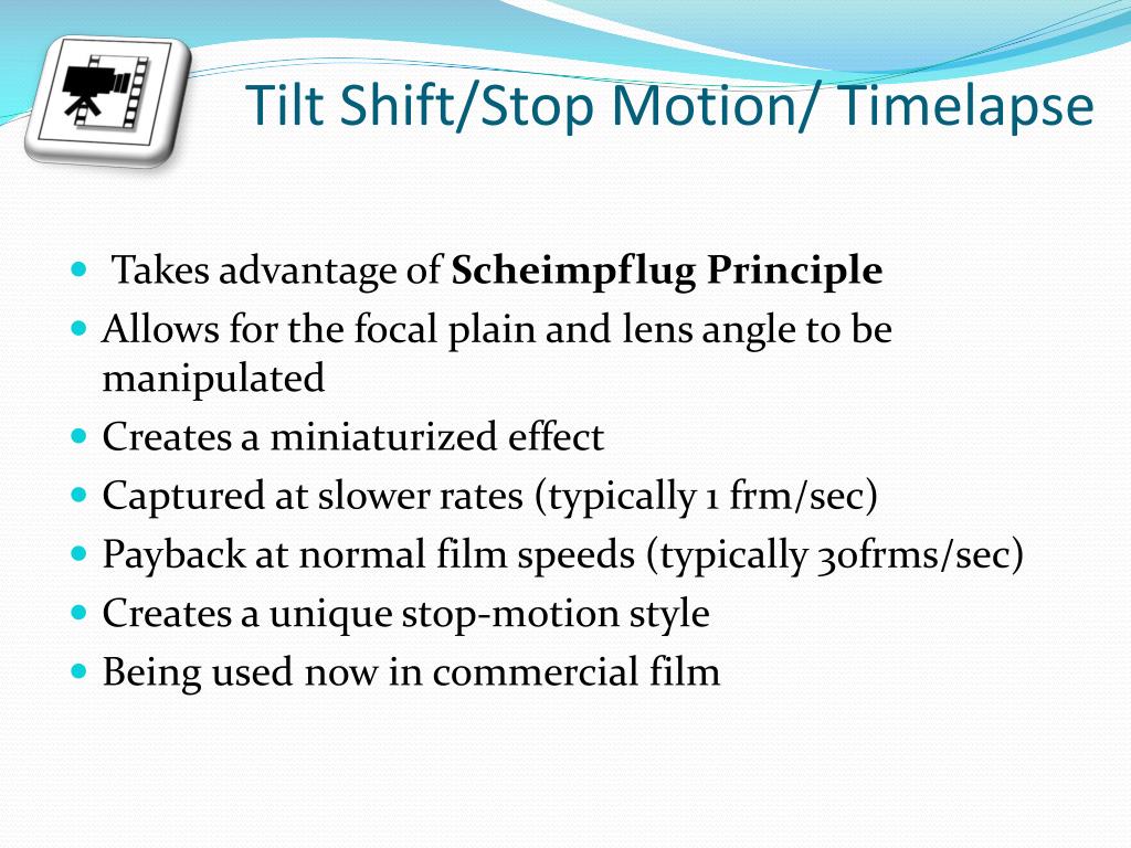 Tilt Shift/Stop Motion/ Timelapse • Takes advantage of Scheimpflug Principle • Allows for the focal plain and lens angle to be manipulated • Creates a miniaturized effect • Captured at slower rates (typically 1 frm/sec) • Payback at normal film speeds (typically 30frms/sec) • Creates a unique stop-motion style • Being used now in commercial film