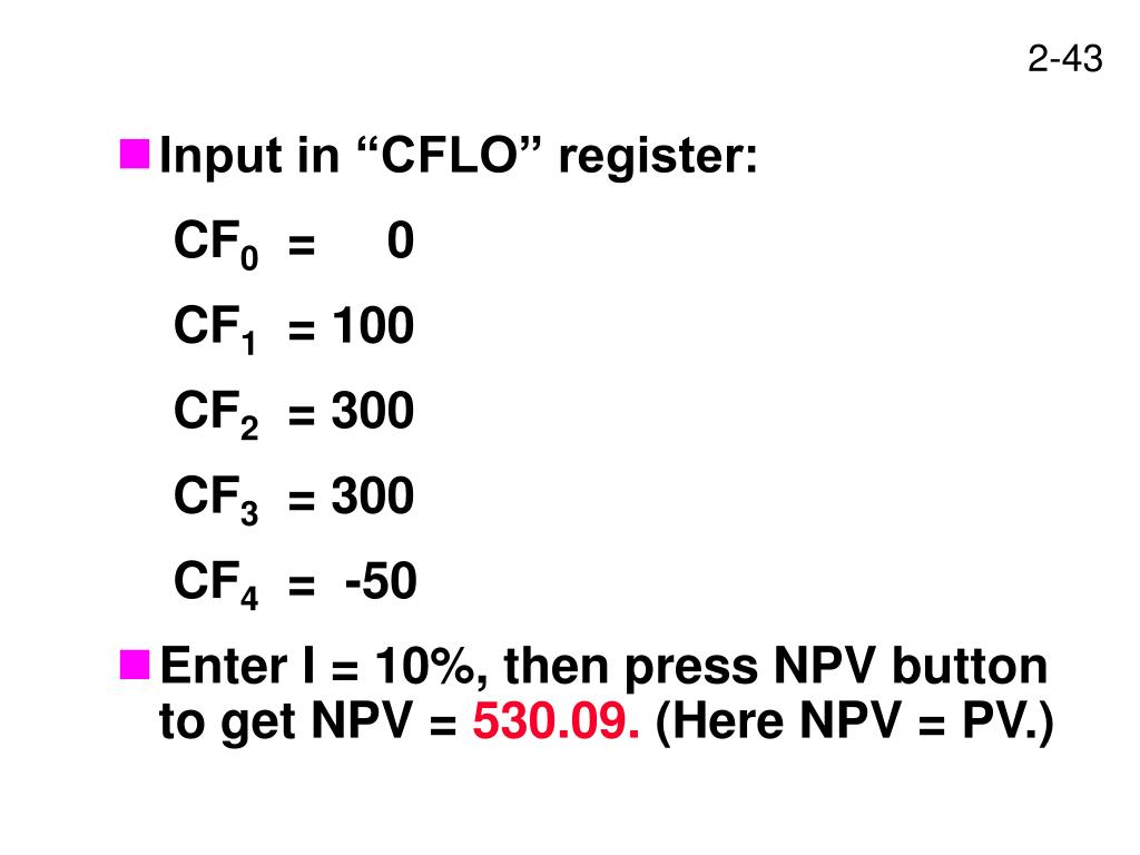 Input in “CFLO” register: CF0 = 0 CF1 = 100 CF2 = 300 CF3 = 300 CF4 = -50 • Enter I = 10%, then press NPV button to get NPV = 530.09. (Here NPV = PV.)