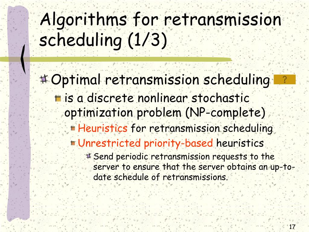Algorithms for retransmission scheduling (1/3) • Optimal retransmission scheduling • is a discrete nonlinear stochastic optimization problem (NP-complete) • Heuristics for retransmission scheduling • Unrestricted priority-based heuristics • Send periodic retransmission requests to the server to ensure that the server obtains an up-to-date schedule of retransmissions.