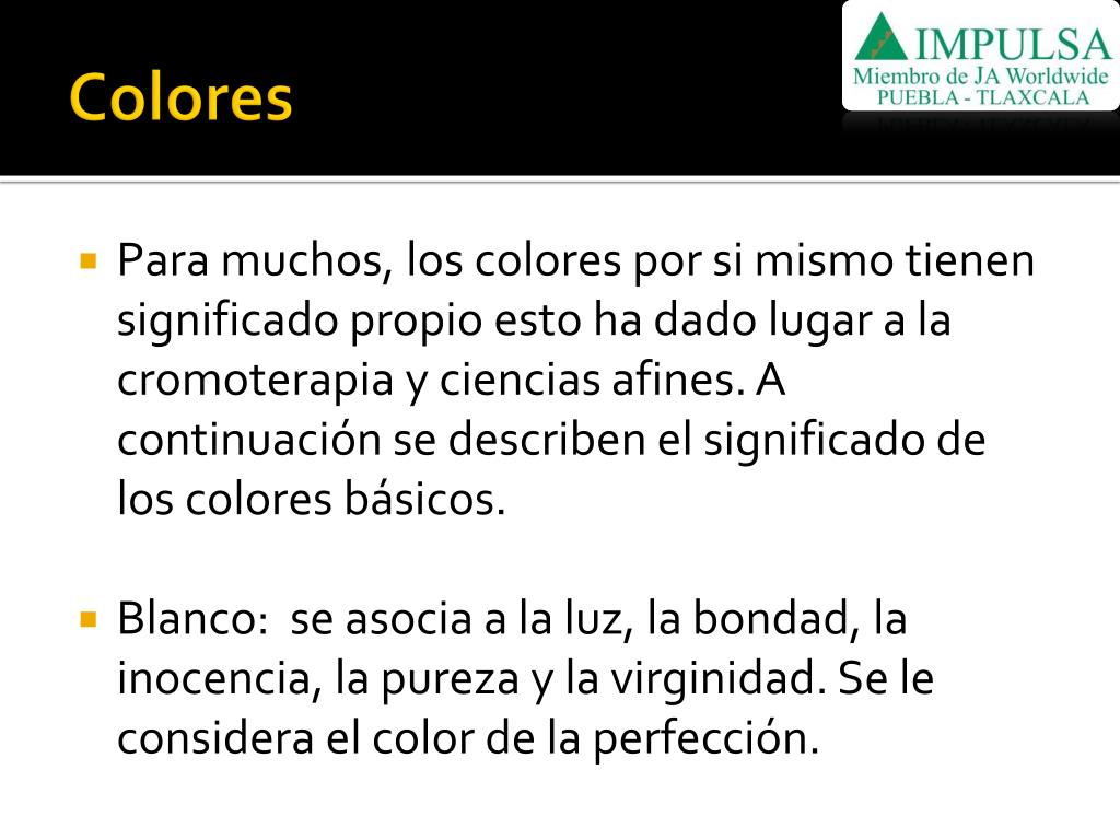 Colores • Para muchos, los colores por si mismo tienen significado propio esto ha dado lugar a la cromoterapia y ciencias afines. A continuación se describen el significado de los colores básicos. • Blanco: se asocia a la luz, la bondad, la inocencia, la pureza y la virginidad. Se le considera el color de la perfección.