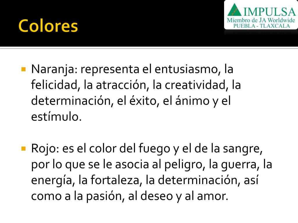 Colores • Naranja: representa el entusiasmo, la felicidad, la atracción, la creatividad, la determinación, el éxito, el ánimo y el estímulo. • Rojo: es el color del fuego y el de la sangre, por lo que se le asocia al peligro, la guerra, la energía, la fortaleza, la determinación, así como a la pasión, al deseo y al amor.