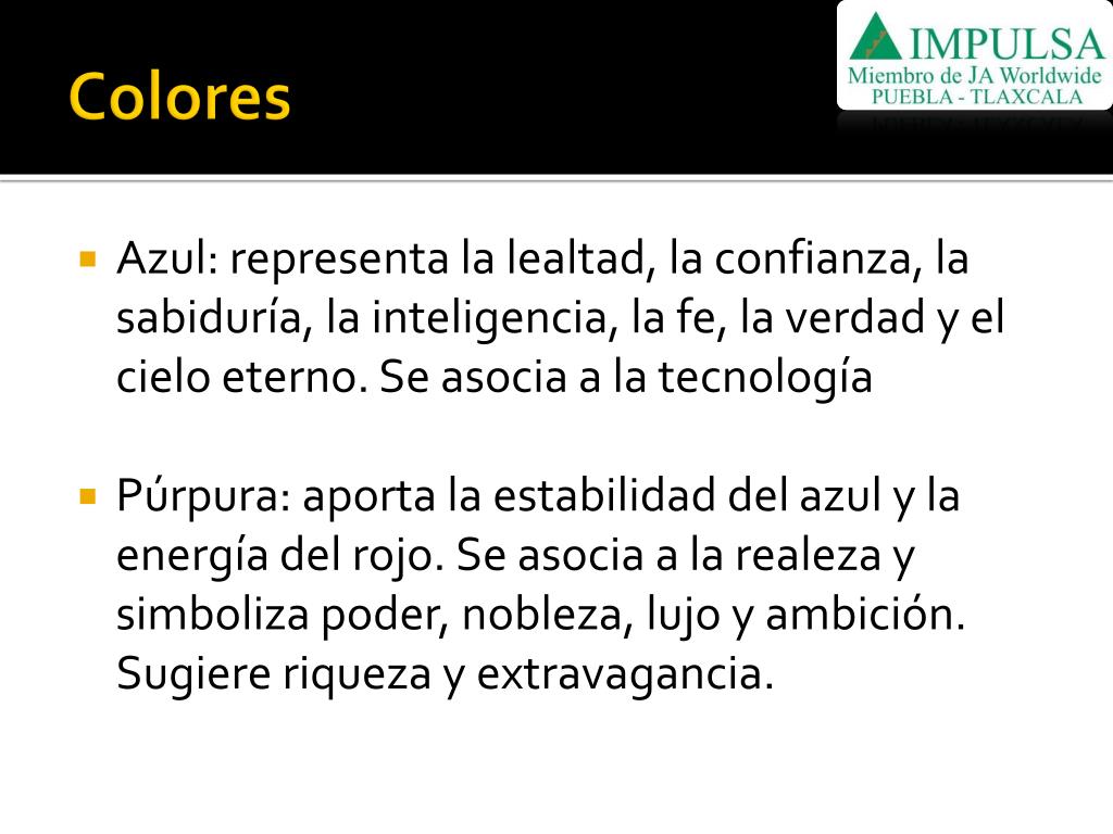 Colores • Azul: representa la lealtad, la confianza, la sabiduría, la inteligencia, la fe, la verdad y el cielo eterno. Se asocia a la tecnología • Púrpura: aporta la estabilidad del azul y la energía del rojo. Se asocia a la realeza y simboliza poder, nobleza, lujo y ambición. Sugiere riqueza y extravagancia.