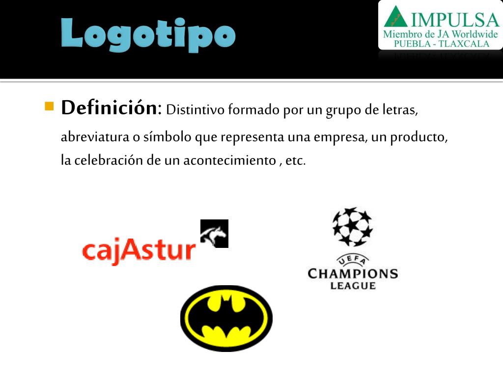 Logotipo • Definición: Distintivo formado por un grupo de letras, abreviatura o símbolo que representa una empresa, un producto, la celebración de un acontecimiento , etc.