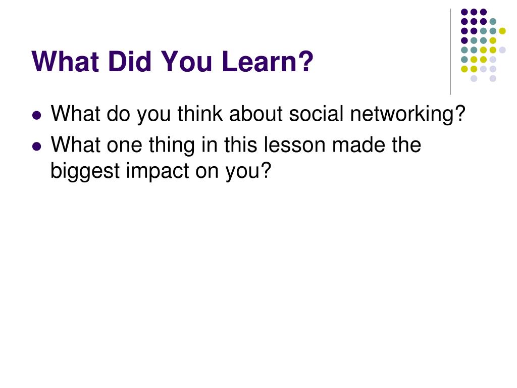 What Did You Learn? • What do you think about social networking? • What one thing in this lesson made the biggest impact on you?