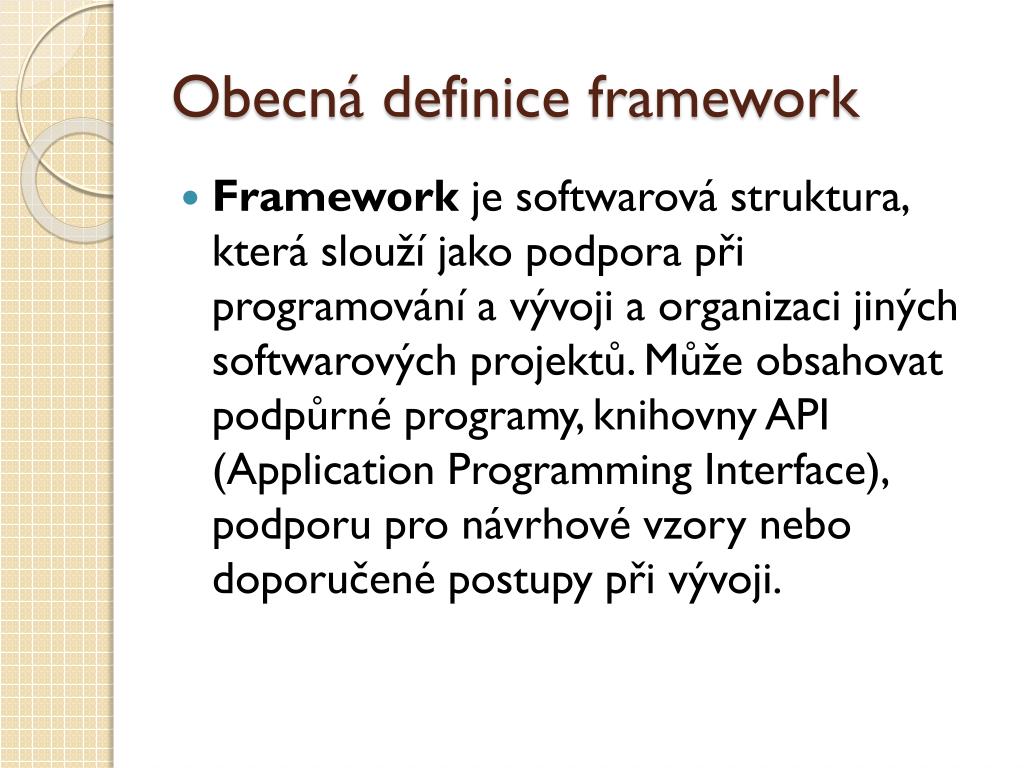 Obecná definice framework • Framework je softwarová struktura, která slouží jako podpora při programování a vývoji a organizaci jiných softwarových projektů. Může obsahovat podpůrné programy, knihovny API (ApplicationProgrammingInterface), podporu pro návrhové vzory nebo doporučené postupy při vývoji.