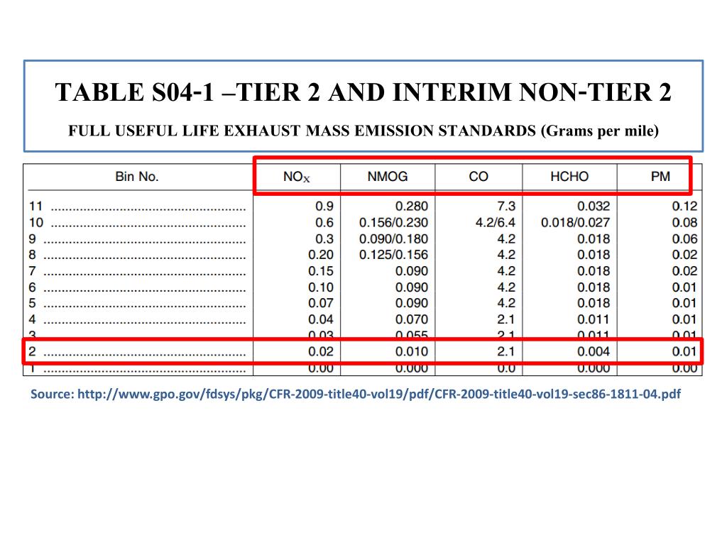 TABLE S04-1 –TIER 2 AND INTERIM NON-TIER 2 FULL USEFUL LIFE EXHAUST MASS EMISSION STANDARDS (Grams per mile) Source: http://www.gpo.gov/fdsys/pkg/CFR-2009-title40-vol19/pdf/CFR-2009-title40-vol19-sec86-1811-04.pdf