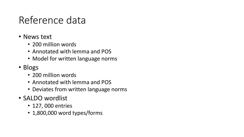 Reference data • News text • 200 million words • Annotated with lemma and POS • Model for written language norms • Blogs • 200 million words • Annotated with lemma and POS • Deviates from written language norms • SALDO wordlist • 127, 000 entries • 1,800,000 word types/forms