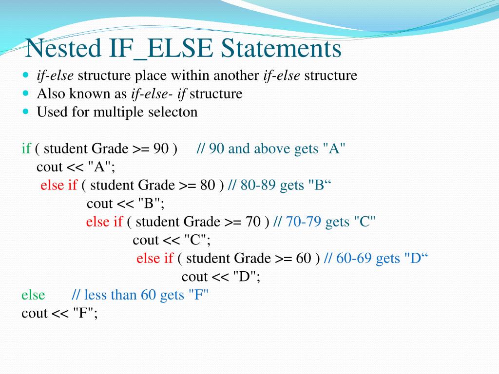 Nested IF_ELSE Statements • if-else structure place within another if-else structure • Also known as if-else- if structure • Used for multiple selecton if( student Grade >= 90 ) // 90 and above gets "A" cout << "A"; else if ( student Grade >= 80 ) // 80-89 gets "B“ cout << "B"; else if ( student Grade >= 70 ) // 70-79 gets "C" cout << "C"; else if ( student Grade >= 60 ) // 60-69 gets "D“ cout << "D"; else // less than 60 gets "F" cout << "F";