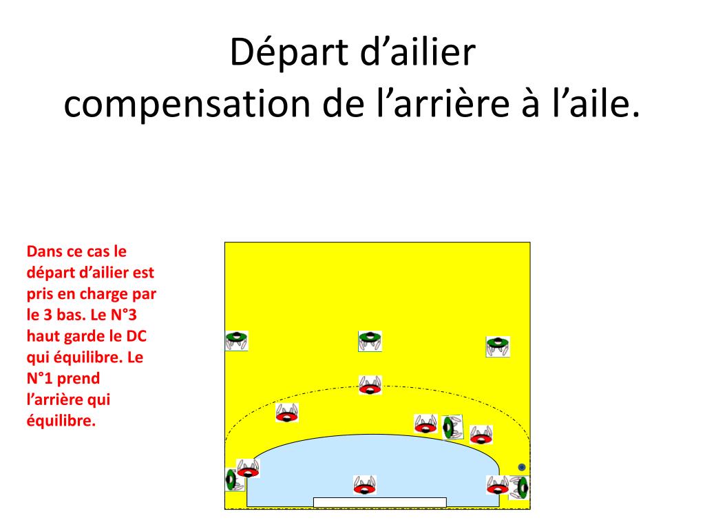 Départ d’ailier compensation de l’arrière à l’aile. Dans ce cas le départ d’ailier est pris en charge par le 3 bas. Le N°3 haut garde le DC qui équilibre. Le N°1 prend l’arrière qui équilibre.