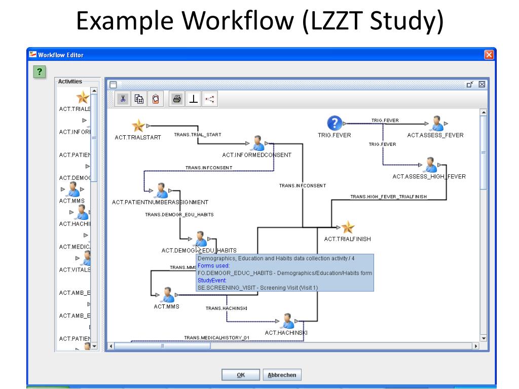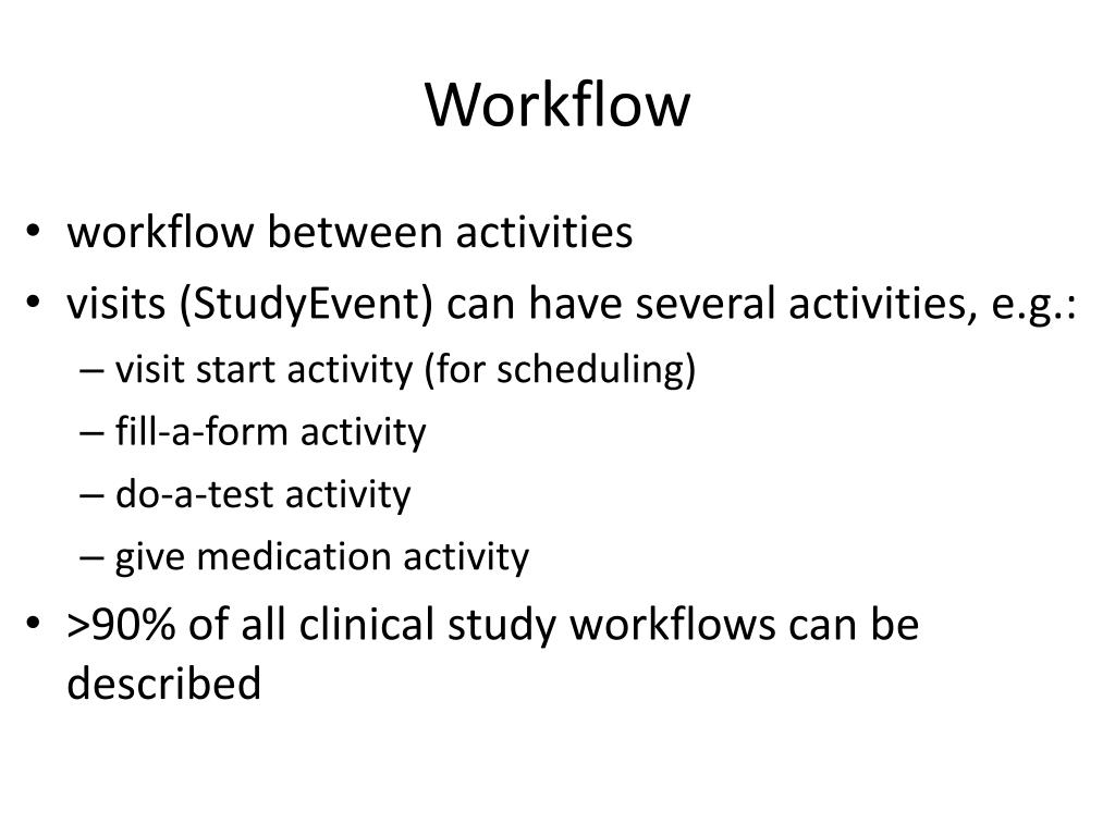 Workflow • workflow between activities • visits (StudyEvent) can have several activities, e.g.: • visit start activity (for scheduling) • fill-a-form activity • do-a-test activity • give medication activity • >90% of all clinical study workflows can be described