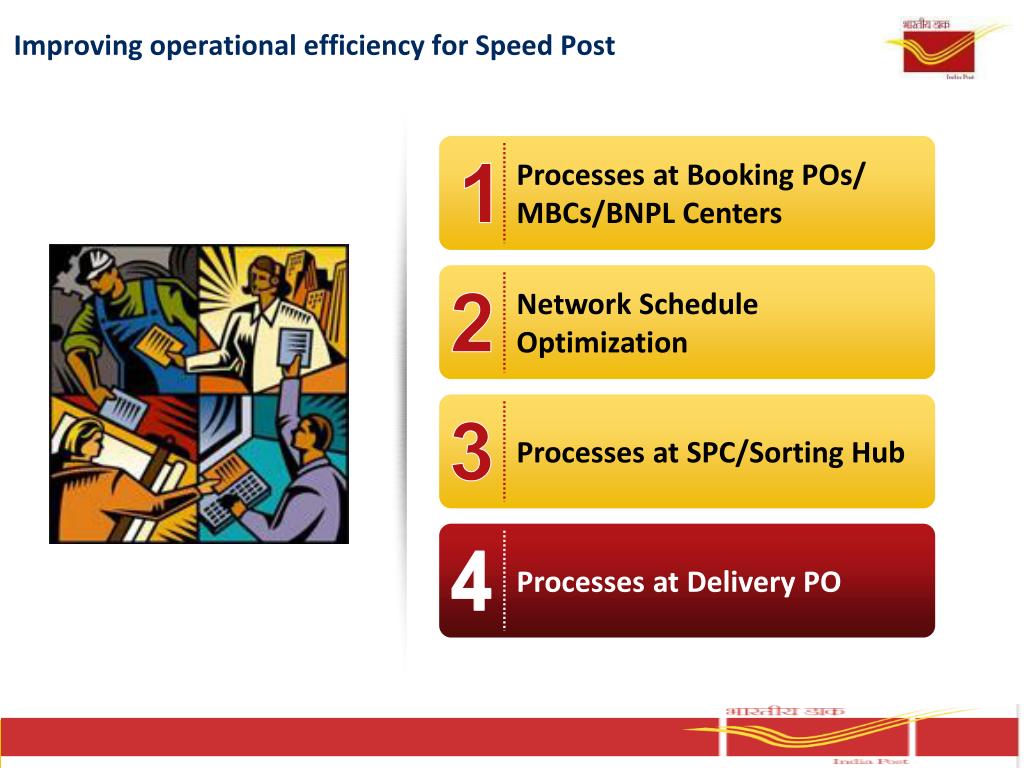 Processes at Booking POs/ MBCs/BNPL Centers 1 Network Schedule Optimization 2 3 Processes at SPC/Sorting Hub 4 Processes at Delivery PO Improving operational efficiency for Speed Post Text SOURCE: Mail Network Optimisation Project