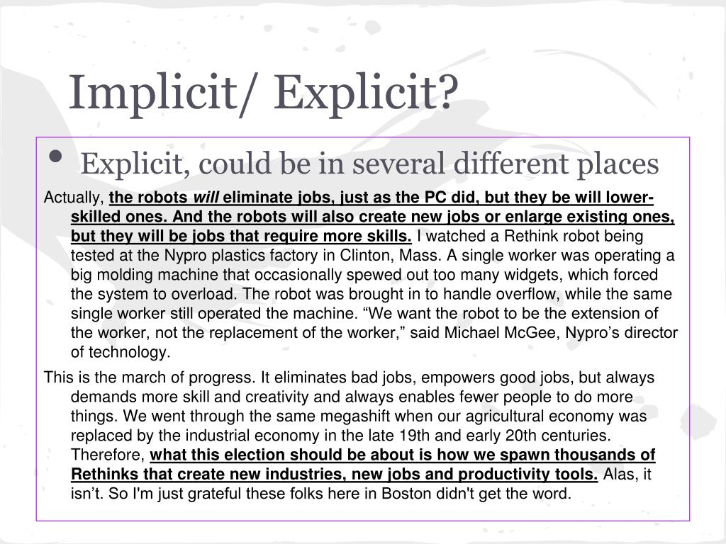 Implicit/ Explicit? • Explicit, could be in several different places Actually, the robots will eliminate jobs, just as the PC did, but they be will lower-skilled ones. And the robots will also create new jobs or enlarge existing ones, but they will be jobs that require more skills.I watched a Rethink robot being tested at the Nypro plastics factory in Clinton, Mass. A single worker was operating a big molding machine that occasionally spewed out too many widgets, which forced the system to overload. The robot was brought in to handle overflow, while the same single worker still operated the machine. “We want the robot to be the extension of the worker, not the replacement of the worker,” said Michael McGee, Nypro’s director of technology. This is the march of progress. It eliminates bad jobs, empowers good jobs, but always demands more skill and creativity and always enables fewer people to do more things. We went through the same megashift when our agricultural economy was replaced by the industrial economy in the late 19th and early 20th centuries. Therefore, what this election should be about is how we spawn thousands of Rethinks that create new industries, new jobs and productivity tools. Alas, it isn’t. So I'm just grateful these folks here in Boston didn't get the word.