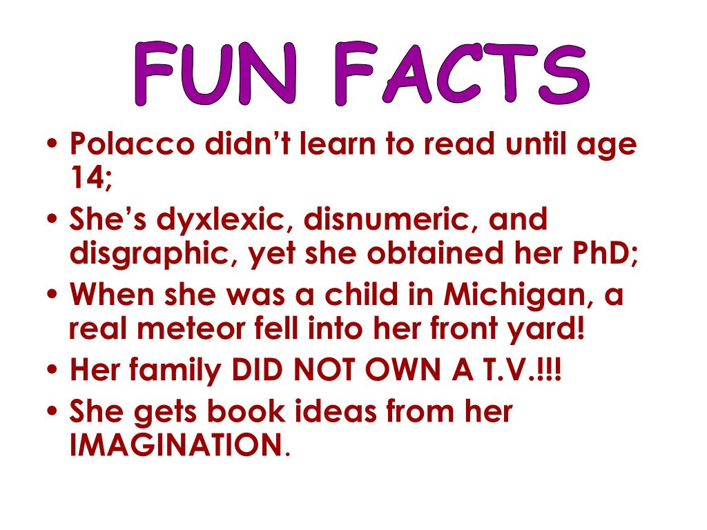 FUN FACTS • Polacco didn’t learn to read until age 14; • She’s dyxlexic, disnumeric, and disgraphic, yet she obtained her PhD; • When she was a child in Michigan, a real meteor fell into her front yard! • Her family DID NOT OWN A T.V.!!! • She gets book ideas from her IMAGINATION.