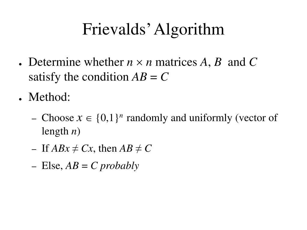 Frievalds’ Algorithm Determine whether nn matrices A, B and C satisfy the condition AB = C Method: Choose x{0,1}nrandomly and uniformly (vector of length n) If ABx≠Cx, then AB≠ C Else, AB = Cprobably