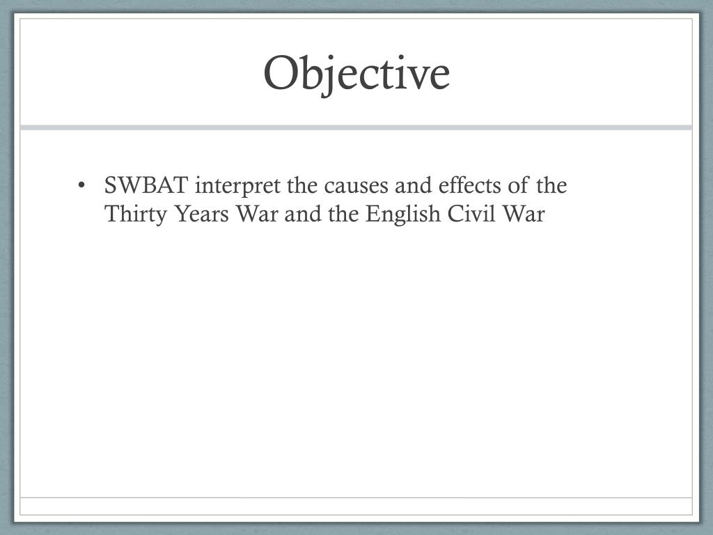 Thirty Years War. Objective. SWBAT interpret the causes and effects of the Thirty Years War and the English Civil War. DO NOW. Pick up the chart for the 30 Years War notes. In your notes or on a separate sheet of paper list the causes and effects of the Spanish Armada.