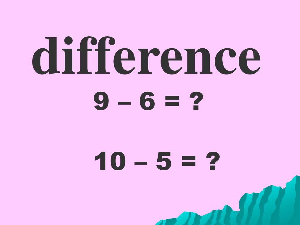 difference difference - the answer in subtraction. Example: 9 – 4 = 5 The difference is 5.