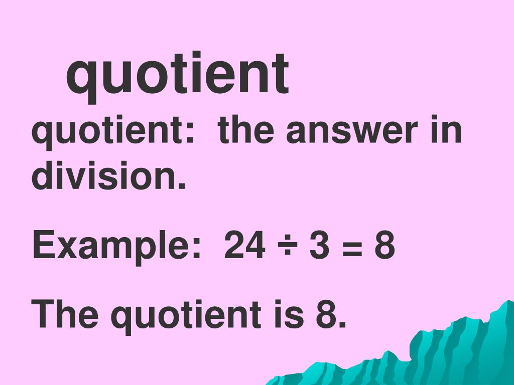 quotient quotient: the answer in division. Example: 24 ÷ 3 = 8 The quotient is 8.