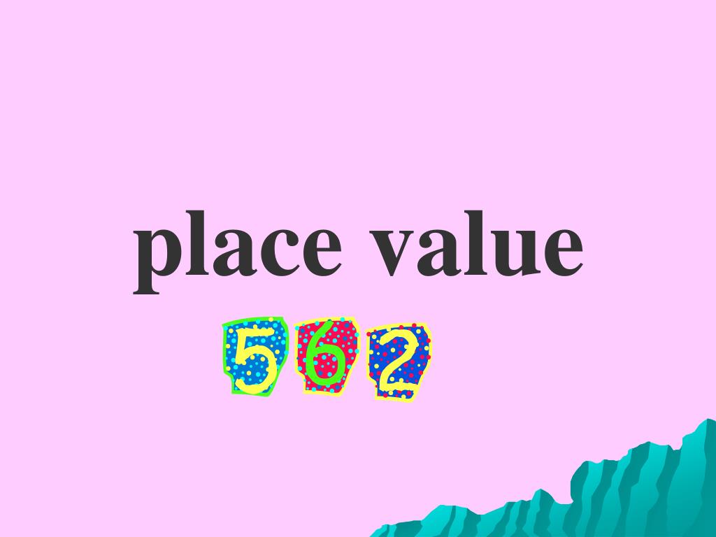 place value place value- the value determined by the position of a digit in a number. Example: In 562, the digit 5 means 5 hundreds, the digit 6 means 6 tens, and the digit 2 means 2 ones.