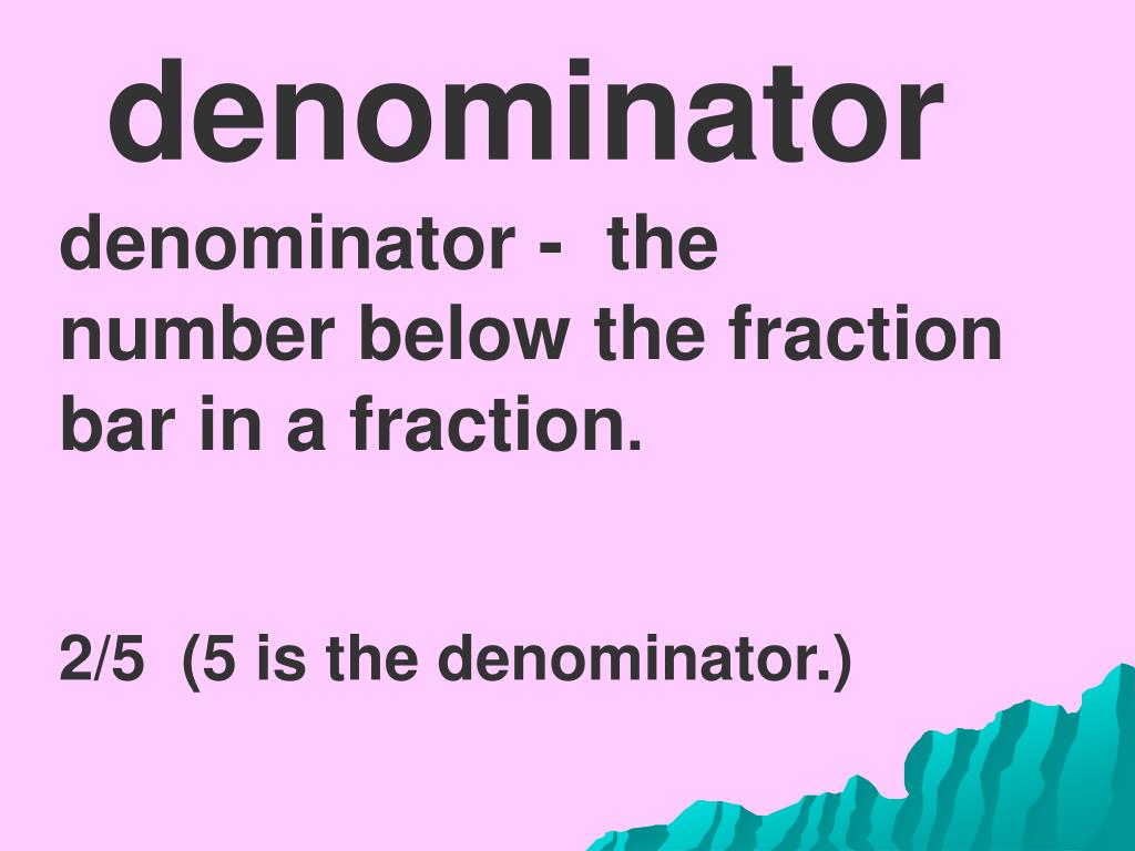 denominator denominator - the number below the fraction bar in a fraction. 2/5 (5 is the denominator.)