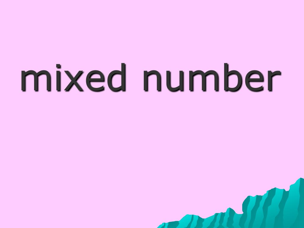 mixed number mixed number- a number written as a whole number and a fraction. Example: 2 ¾