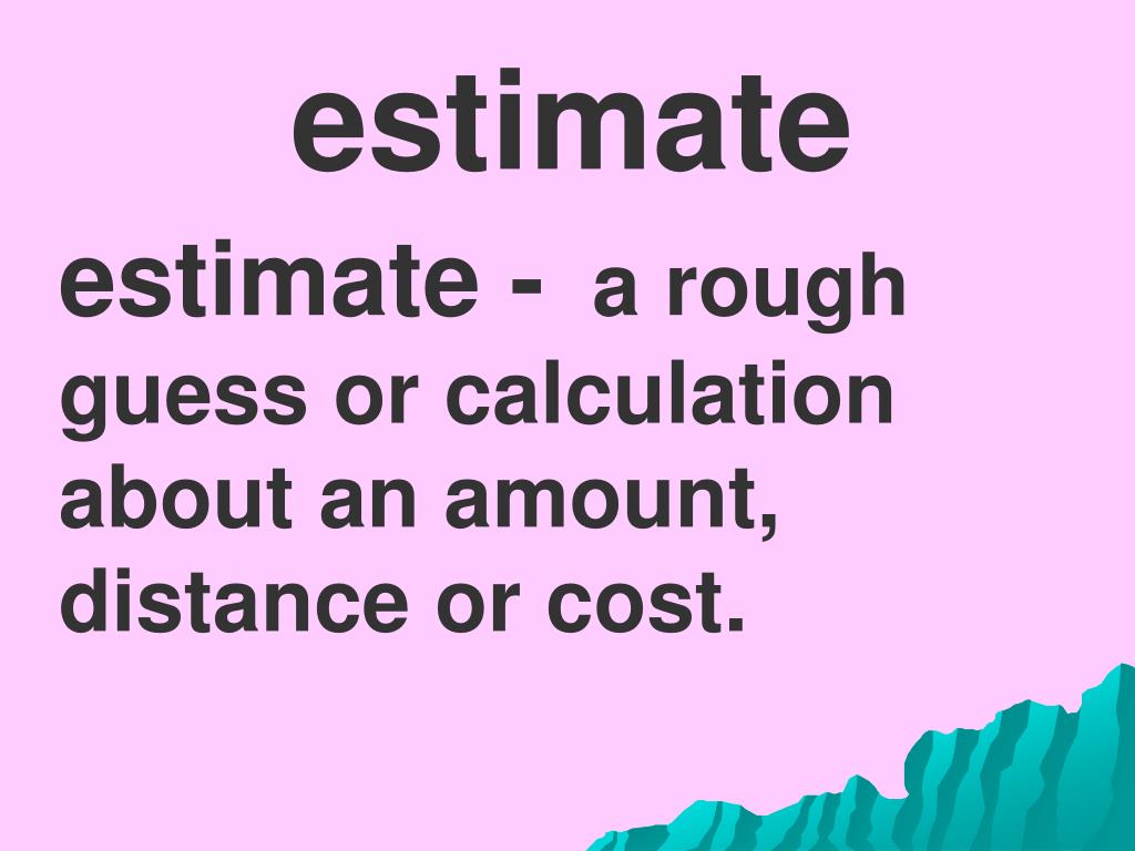estimate estimate -a rough guess or calculation about an amount, distance or cost.