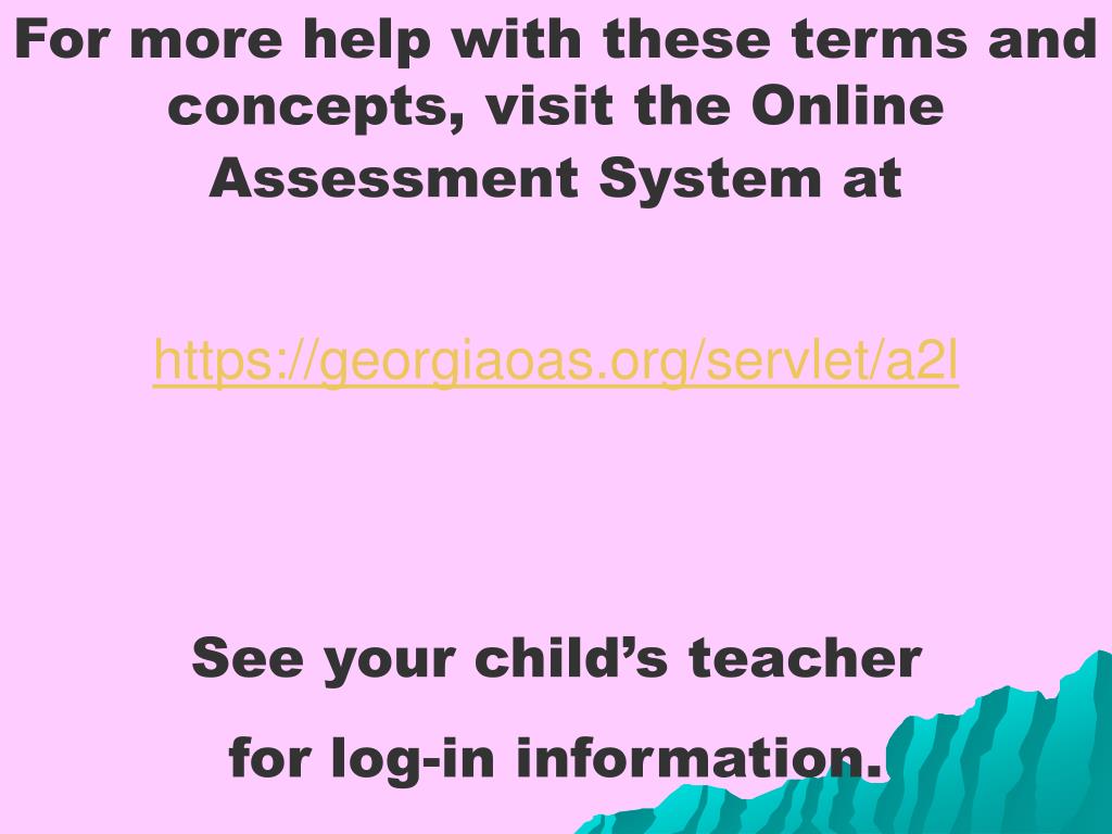 For more help with these terms and concepts, visit the Online Assessment System at https://georgiaoas.org/servlet/a2l See your child’s teacher for log-in information.