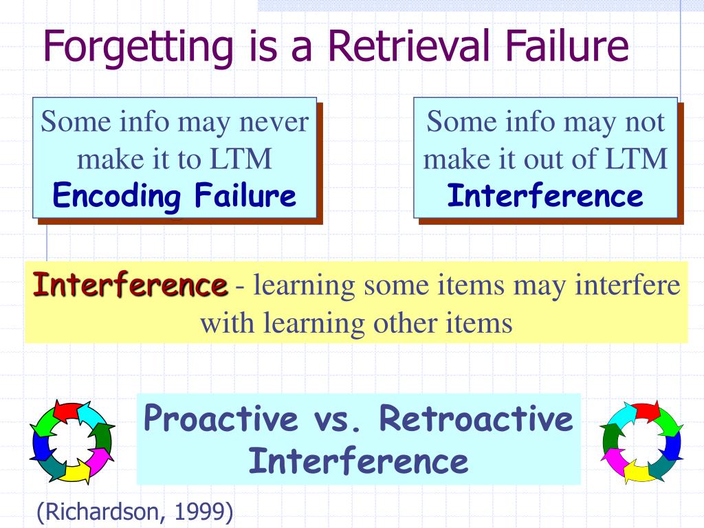 Forgetting is a Retrieval Failure Some info may never make it to LTM Encoding Failure Some info may not make it out of LTM Interference Interference - learning some items may interfere with learning other items Proactive vs. Retroactive Interference (Richardson, 1999)