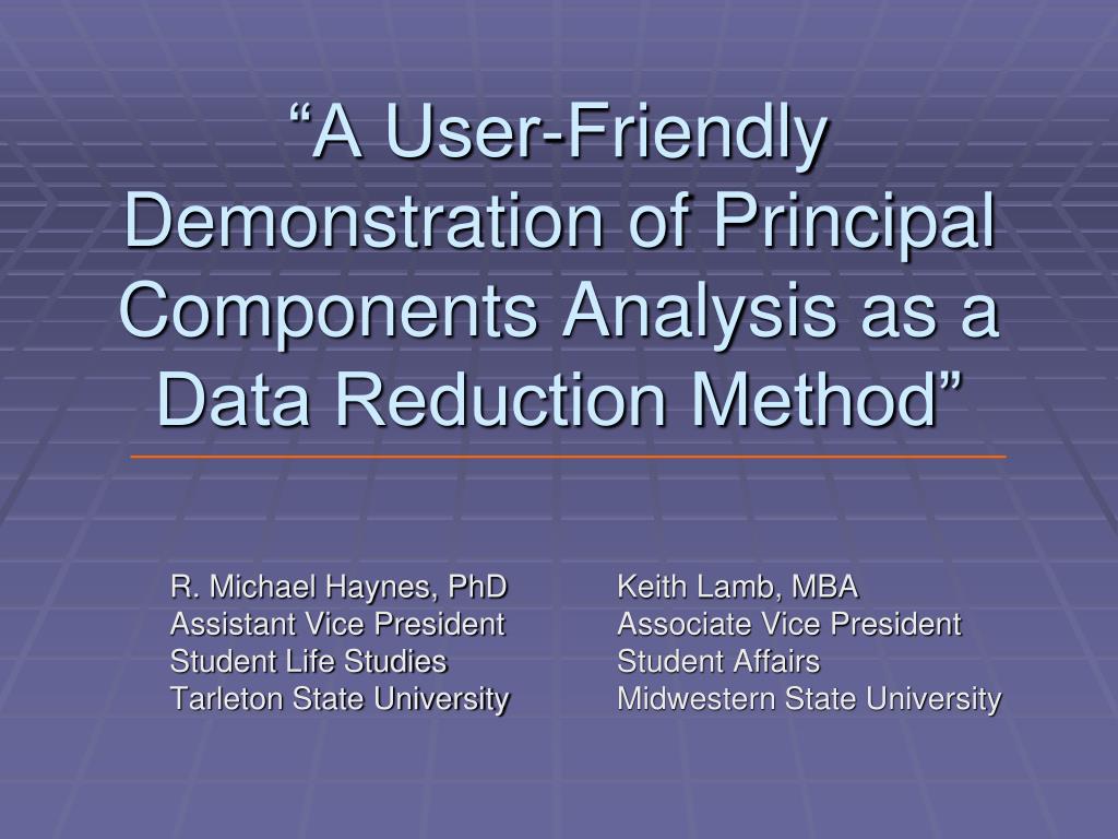“A User-Friendly Demonstration of Principal Components Analysis as a Data Reduction Method”. R. Michael Haynes, PhD Keith Lamb, MBA Assistant Vice President Associate Vice President Student Life Studies Student Affairs Tarleton State University Midwestern State University.