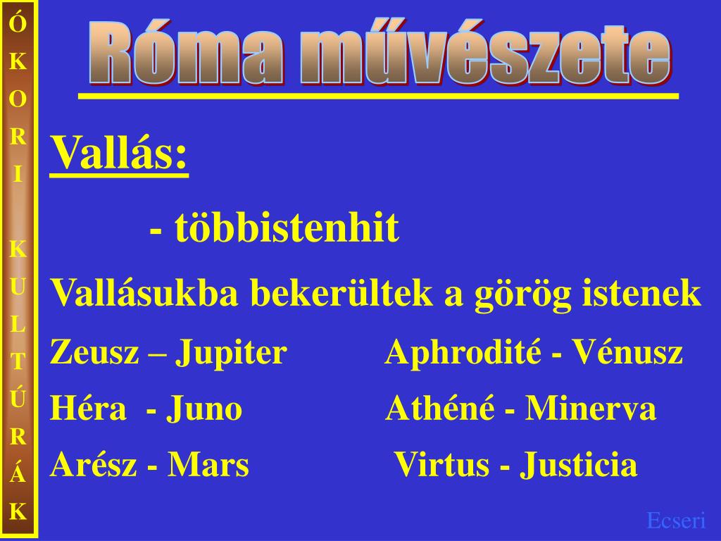 ÓKORIKULTÚRÁK Róma művészete Vallás: - többistenhitVallásukba bekerültek a görög istenekZeusz – Jupiter Aphrodité - VénuszHéra - Juno Athéné - MinervaArész - Mars Virtus - Justicia