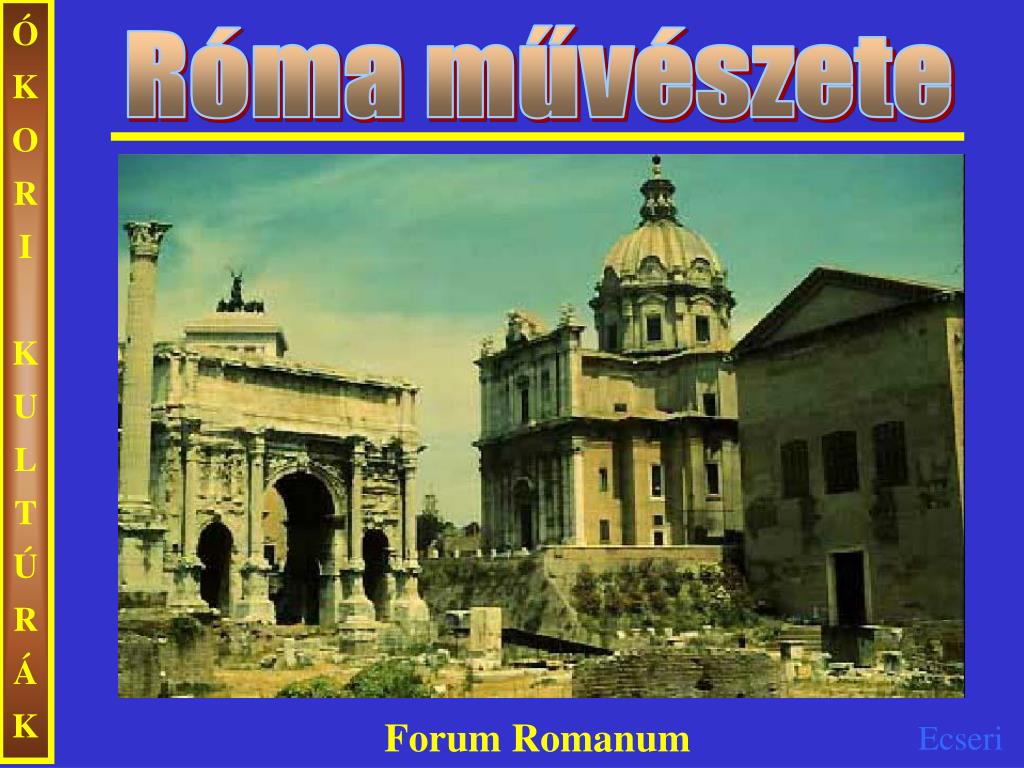 ÓKORIKULTÚRÁK Róma művészete A Forum Romanum a közigazgatási, a politikai, a vallási és a kereskedelmi élet középpontja voltA Forum szépítését a legtöbb császárszívügyének tekintetteLegfontosabb épületei a bazilikák, a templomok, diadalívek, amphiteatrum