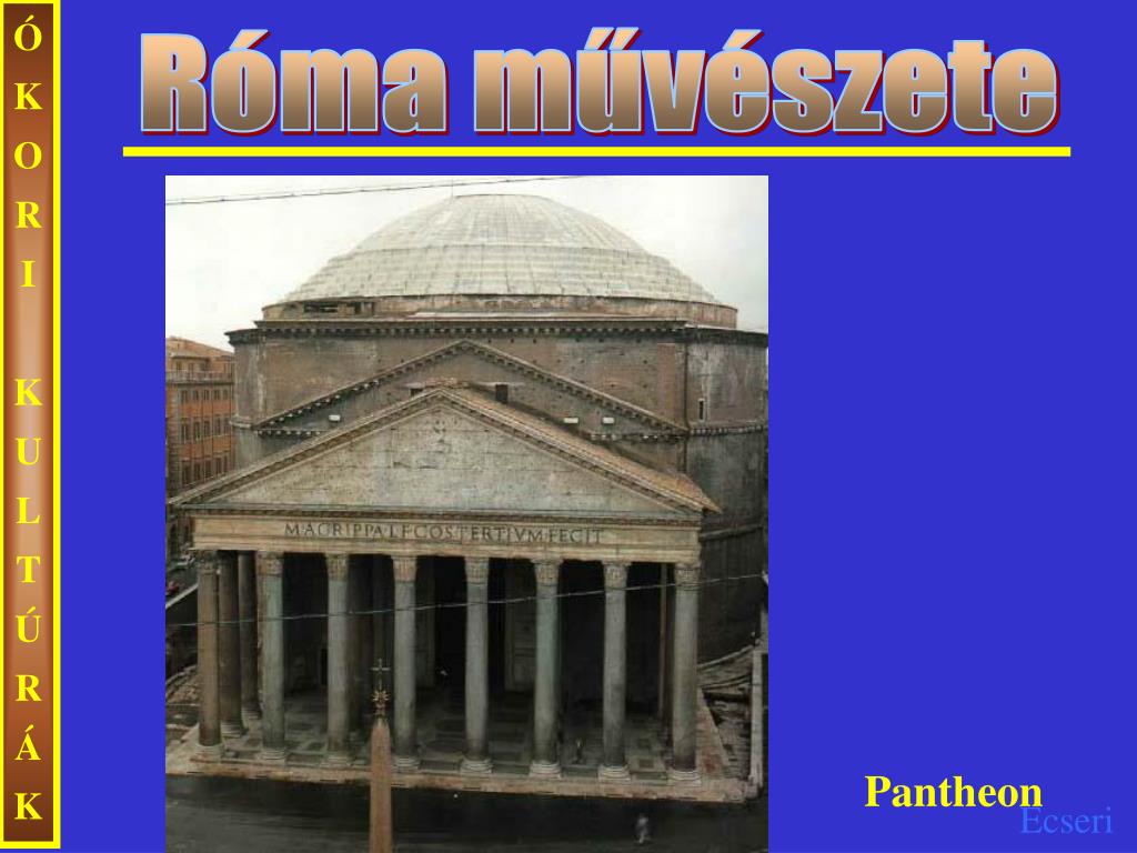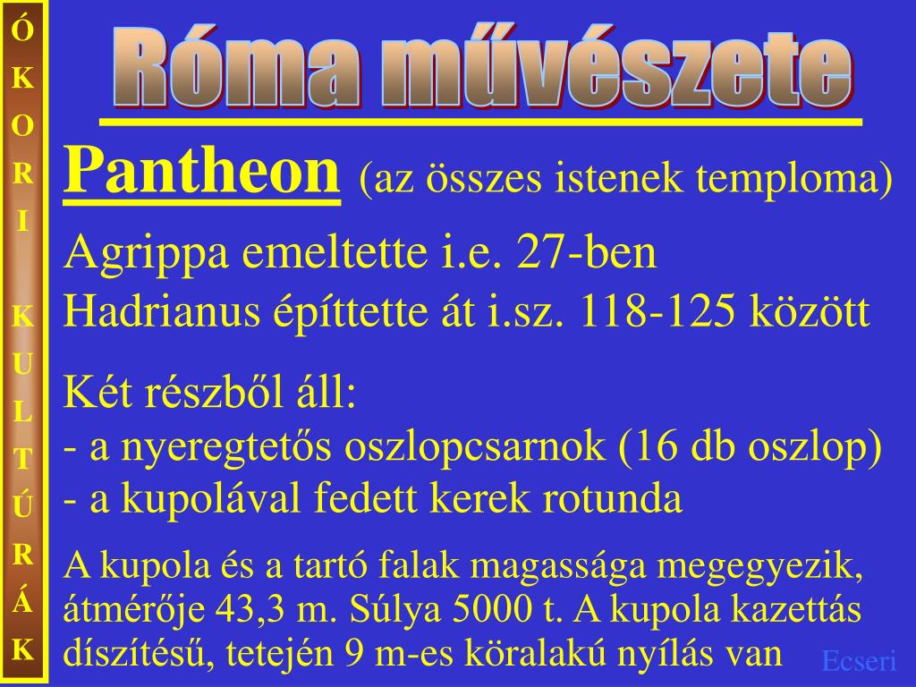 ÓKORIKULTÚRÁK Róma művészete Pantheon(az összes istenek temploma) Agrippa emeltette i.e. 27-benHadrianus építtette át i.sz. 118-125 között Két részből áll:- a nyeregtetős oszlopcsarnok (16 db oszlop)- a kupolával fedett kerek rotunda A kupola és a tartó falak magassága megegyezik,átmérője 43,3 m. Súlya 5000 t. A kupola kazettásdíszítésű, tetején 9 m-es köralakú nyílás van