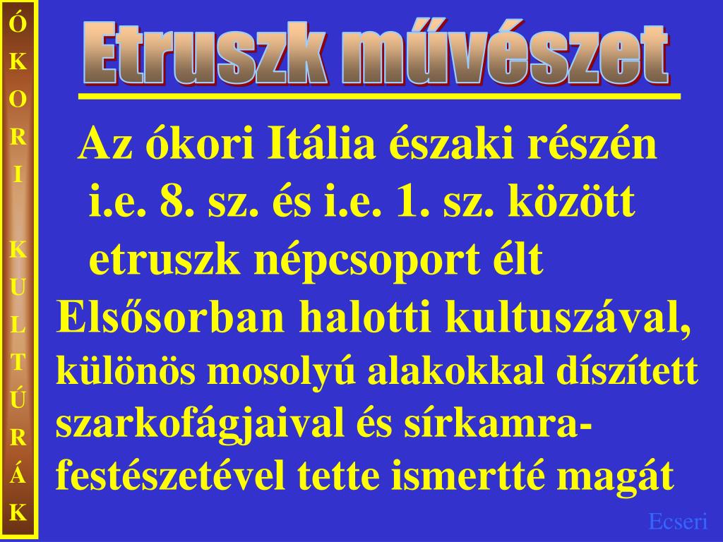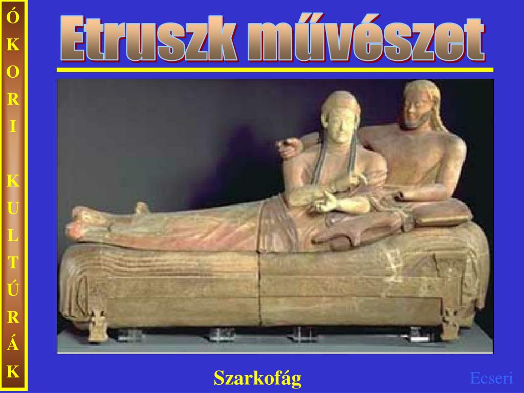 ÓKORIKULTÚRÁK Etruszk művészet Az ókori Itália északi részéni.e. 8. sz. és i.e. 1. sz. közöttetruszk népcsoport éltElsősorban halotti kultuszával,különös mosolyú alakokkal díszítettszarkofágjaival és sírkamra- festészetével tette ismertté magát