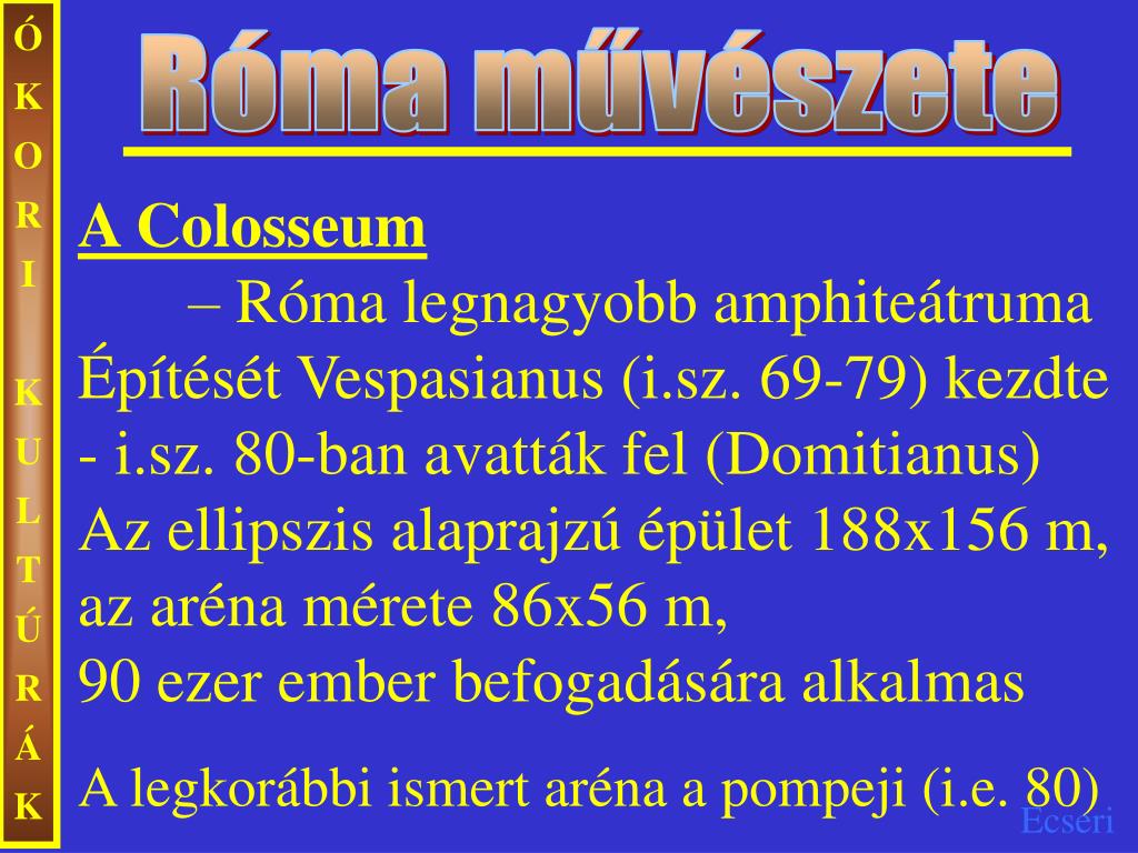 ÓKORIKULTÚRÁK Róma művészete A Colosseum – Róma legnagyobb amphiteátrumaÉpítését Vespasianus (i.sz. 69-79) kezdte - i.sz. 80-ban avatták fel (Domitianus)Az ellipszis alaprajzú épület 188x156 m,az aréna mérete 86x56 m,90 ezer ember befogadására alkalmas A legkorábbi ismert aréna a pompeji (i.e. 80)
