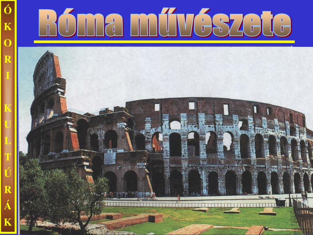 ÓKORIKULTÚRÁK Róma művészete Építészetükbe átvették a görög dór, ion és korinthoszi oszloprendeketKedvelték az ion és korinthoszi formákatmagába foglaló kompozit oszloprendet A római építészeti elemeket görög oszlop-rendekkel párosították – a boltíveket dór ésion oszlopokkal kombinálták – a boltíveksegítségével sík talajon sikerült lépcsőzetesemelkedésű nézőteret kialakítani