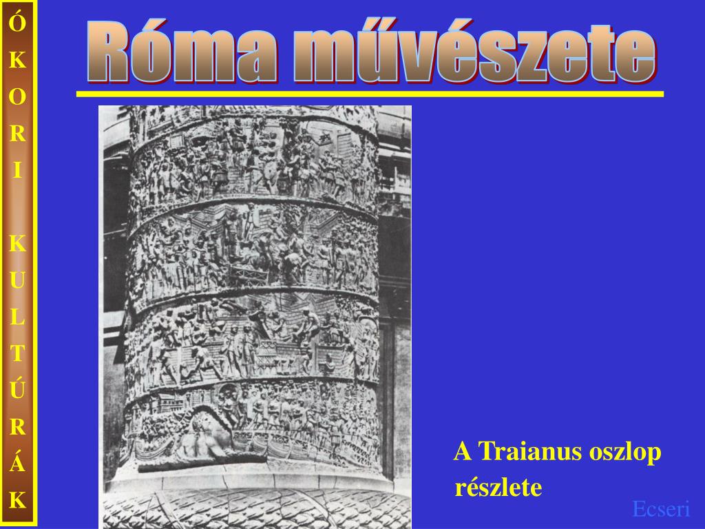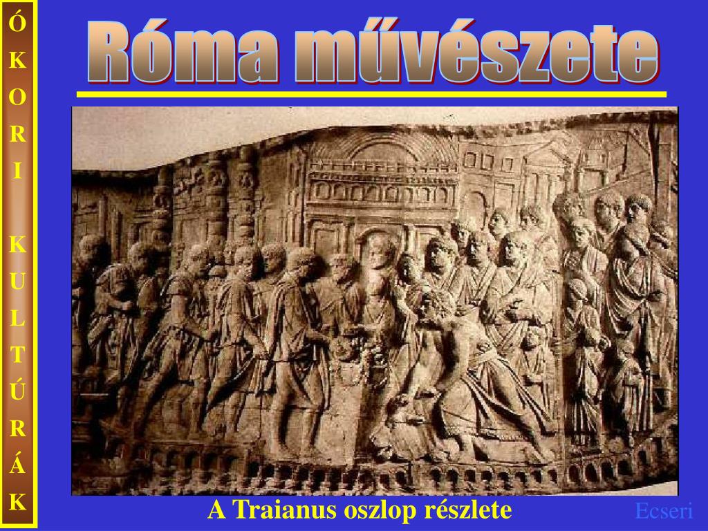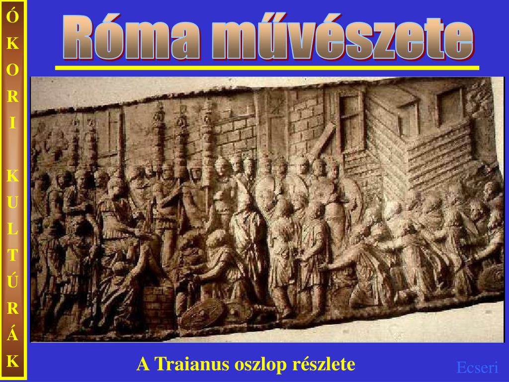 ÓKORIKULTÚRÁK Róma művészete A római művészet vívmányai a diadal-oszlopok és diadalívek, amelyeket azuralkodó tiszteletére építettek Traianus oszlopa – i.sz. 113- a császár dákok elleni hadjáratának és győzelmének emlékére emelték- a 38 m magas oszlop több, üreges belsejű márványhengerből áll