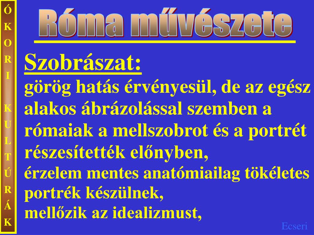 ÓKORIKULTÚRÁK Róma művészete Szobrászat:görög hatás érvényesül, de az egészalakosábrázolással szembena rómaiak a mellszobrot és a portrét részesítették előnyben,érzelem mentes anatómiailag tökéletes portrék készülnek, mellőzik az idealizmust,