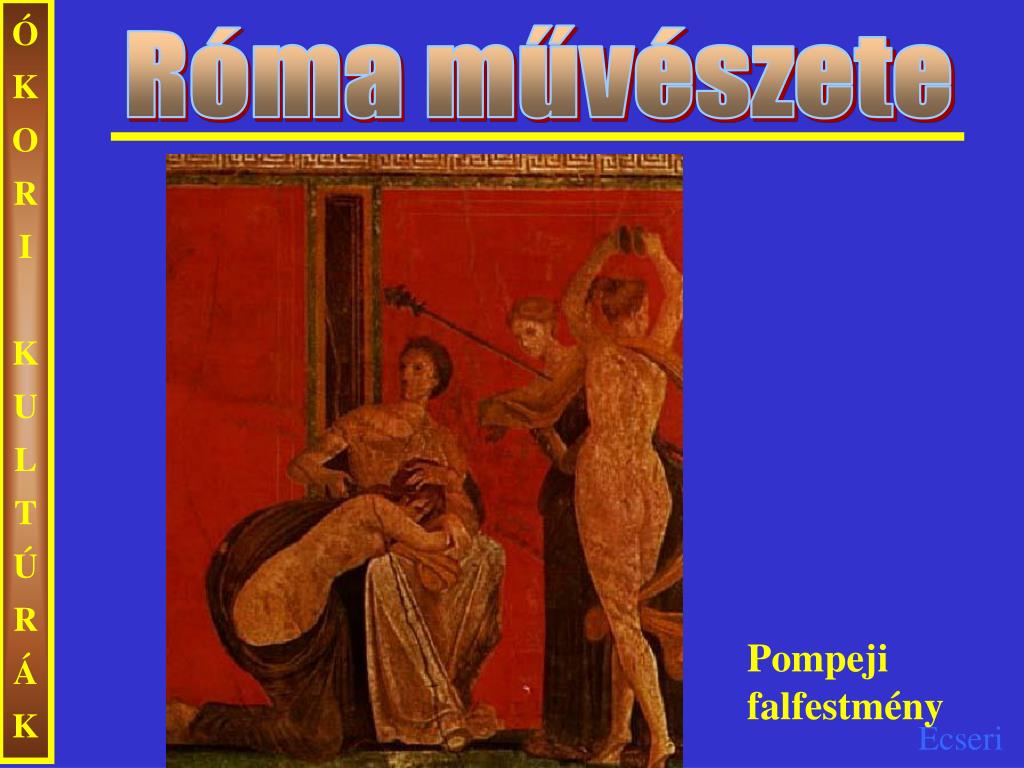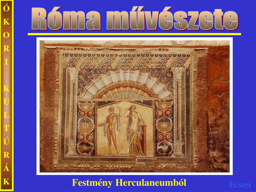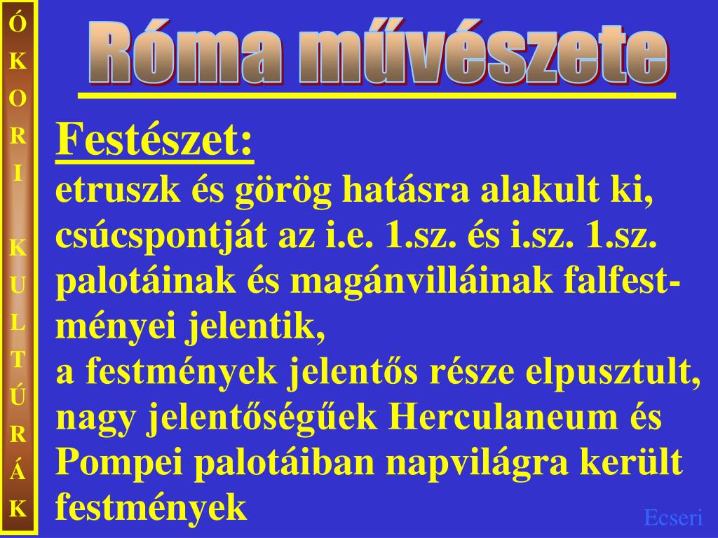 ÓKORIKULTÚRÁK Róma művészete Festészet:etruszk és görög hatásra alakult ki,csúcspontját az i.e. 1.sz. és i.sz. 1.sz.palotáinak és magánvilláinak falfest-ményei jelentik,a festmények jelentős része elpusztult,nagy jelentőségűek Herculaneum és Pompei palotáiban napvilágra kerültfestmények