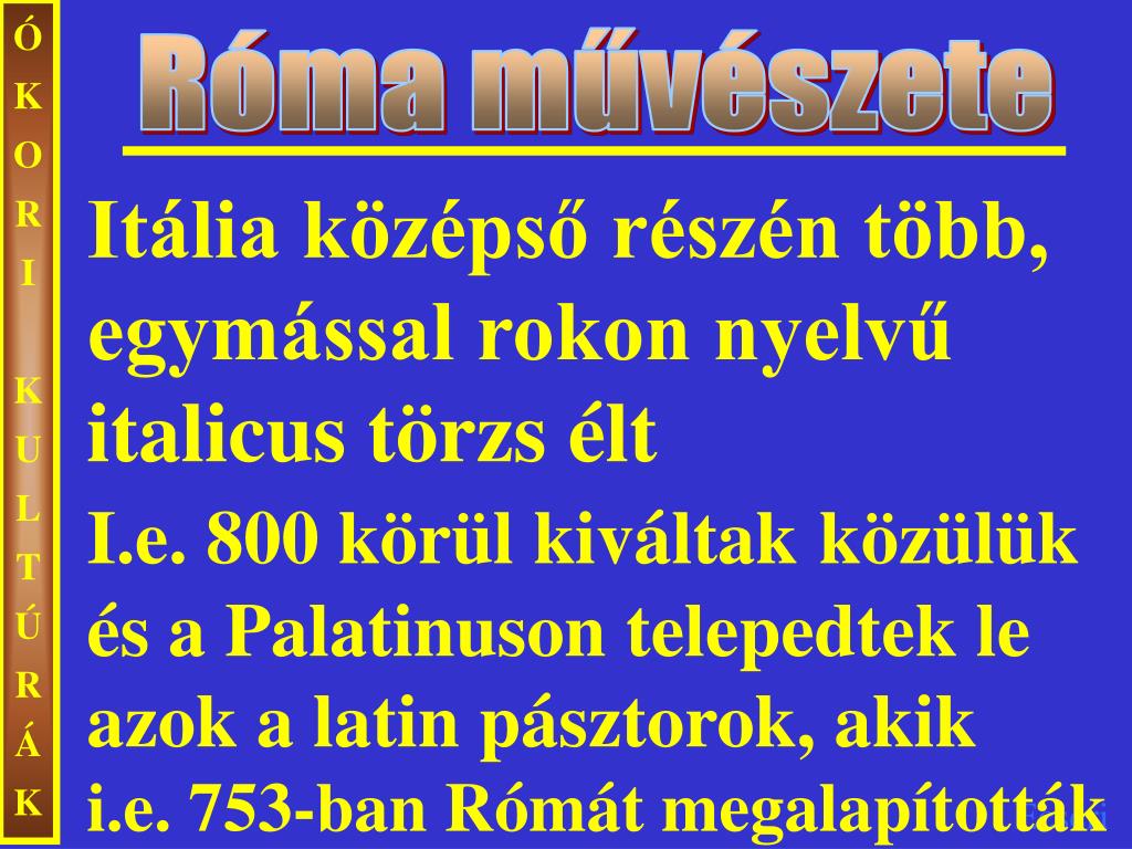 ÓKORIKULTÚRÁK Róma művészete Itália középső részén több,egymással rokon nyelvű italicus törzs éltI.e. 800 körül kiváltakközülükés a Palatinuson telepedtek le azok a latin pásztorok, akiki.e. 753-ban Rómát megalapították