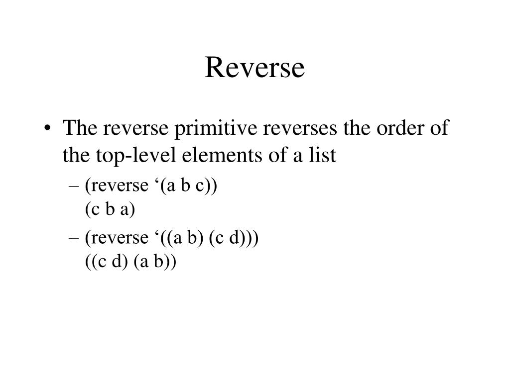 Reverse • The reverse primitive reverses the order of the top-level elements of a list • (reverse ‘(a b c))(c b a) • (reverse ‘((a b) (c d)))((c d) (a b))